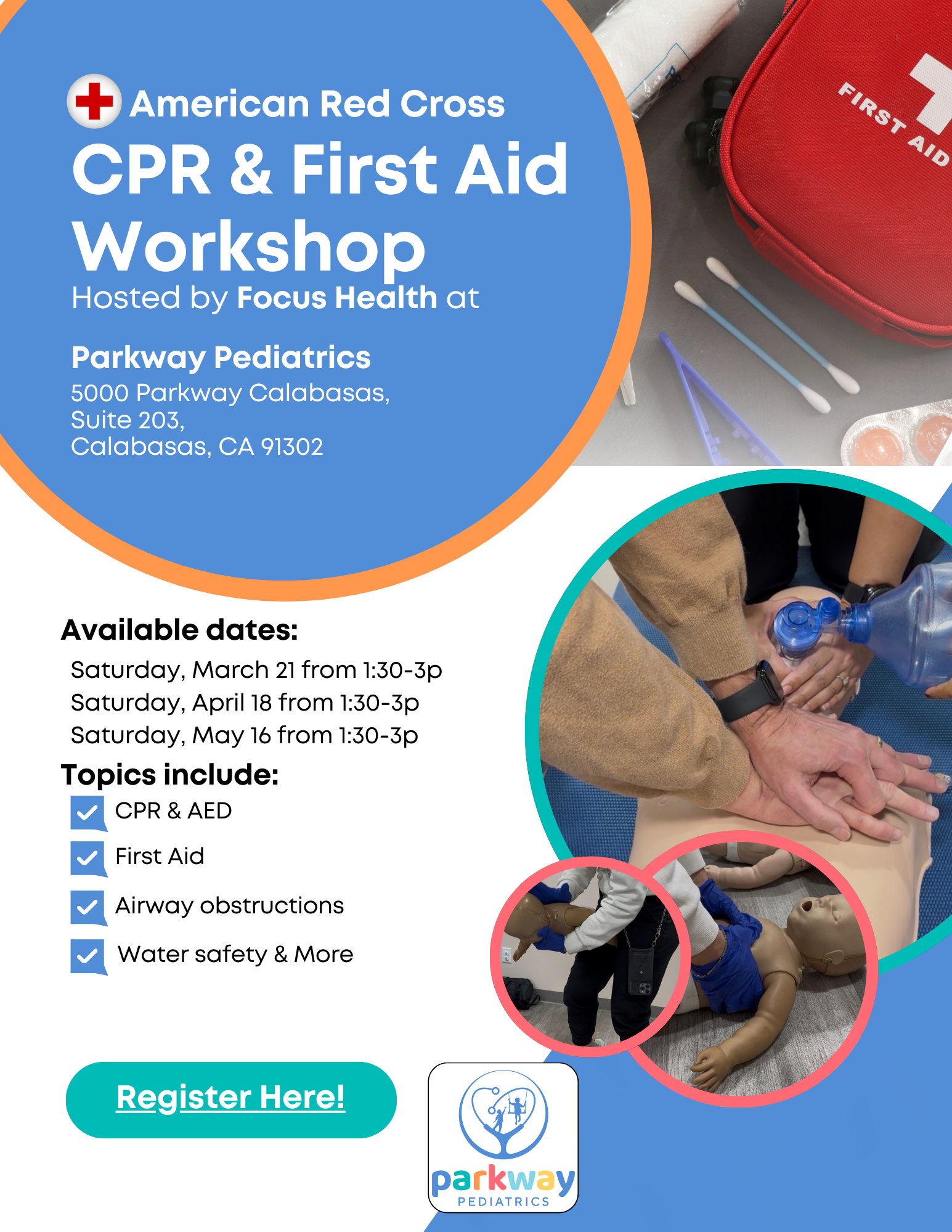 At Parkway Pediatrics, our mission has always been Growing Healthy, Together. Part of that means helping families and our community feel confident not just in everyday health — but in emergency situations, too. We’re excited to partner with Focus Health Co. to bring CPR & First Aid workshops directly to our office. These in-person workshops are designed to give you real-life skills and knowledge you can use when it matters most. Why CPR & First Aid Training Matters Emergencies don’t follow a schedule — and those first few minutes can be critical. Whether you’re at home, at the pool, at a park, or out in the community, knowing how to respond quickly and correctly can save a life. Who Should Attend? These workshops are best for parents and caregivers, grandparents, babysitters and nannies, expectant parents, teachers and coaches--really anyone who wants to feel prepared to help in an emergency! Cost : $40/person Register here: https://focushealth.as.me/Parkway Questions? If you have questions about the workshop or want help deciding if it’s right for you, feel free to contact our office at 818-651-9210. We’re proud to offer opportunities like this to help keep our community safe, prepared, and supported — because when it comes to health and safety, we’re all in this together.